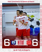 Голы: 0-1 Баталья (Асадов), 1-1 Мелконян, 2-1 Бруно, 2-2 Ниязов (Милованов), 3-2 Бруно, 4-2 Парадински, 5-2 Парадински, 5-3 Асадов (Ниязов), 5-4 Крыкун (Милованов), 5-5 Ниязов (Асадов), 6-5 Павлов, 6-6 Ниязов (Асадов)