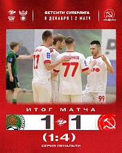 Однако на 36-й минуте встречи Янник сравнял счёт, этот мяч стал первым пропущенным в 12-м туре для нашей команды. Ближе к концу основного времени главный тренер МФК КПРФ Бесо Зоидзе рискнул сыграть в формате «5 на 4», однако больше голов в этой встрече не было, и команды отправились в серию пенальти выявлять сильнейшего.